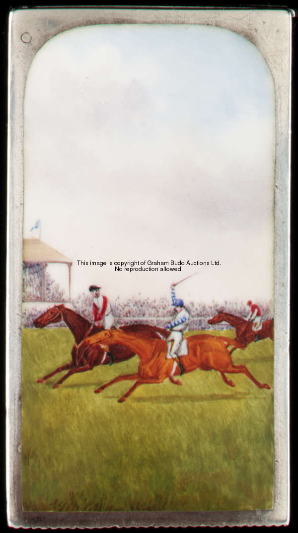 A silver & enamel vesta case by Sampson Mordan & Co., London, 1889, decorated with the finish of a flat race, hinged lid, 5.5 by 3.5cm., 2 1/4 by 1 1/4in.