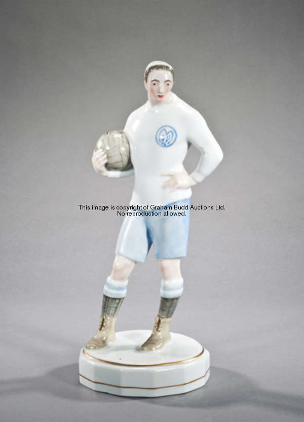 A German porcelain figure of a footballer circa 1930, modelled holding a football