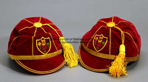 A Jack Grundy Great Britain international Rugby League cap, in red with gold detailing and Great Britain crest, shared illustration