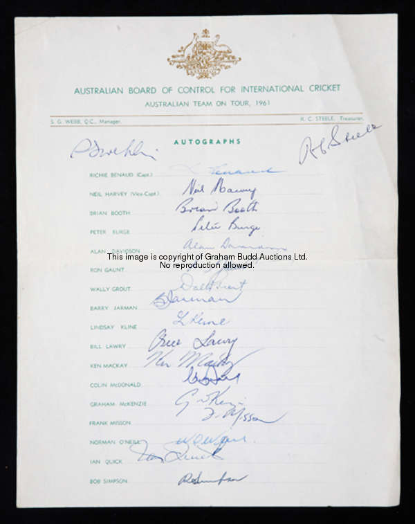 Cricket autographs, including official autograph sheets for the Australian touring teams