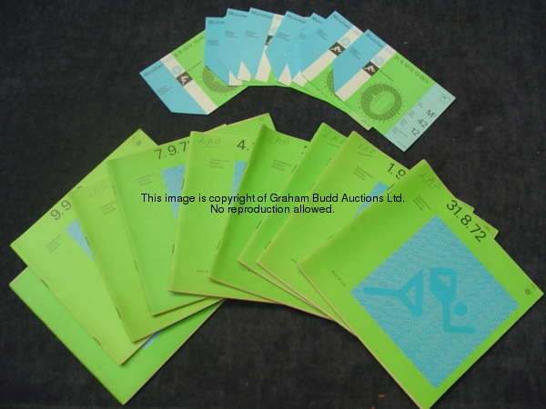 A full set of 9 official daily programmes for athletics at the 1972 Munich Olympic Games, 31st August, 1st-4th and 7th-10th September (no programmes issued for 5th or 6th September due to the taking of Israeli hostages); sold together with 8 tickets for the athletics including for the cancelled 6th September that could be re-used for the newly scheduled day (17)