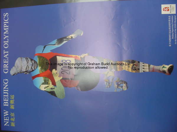 A 2008 Beijing Olympic Games poster, designed as a Terracotta Army soldier running, unframed, 70 by 50cm., 27 1/2 by 19 3/4in.