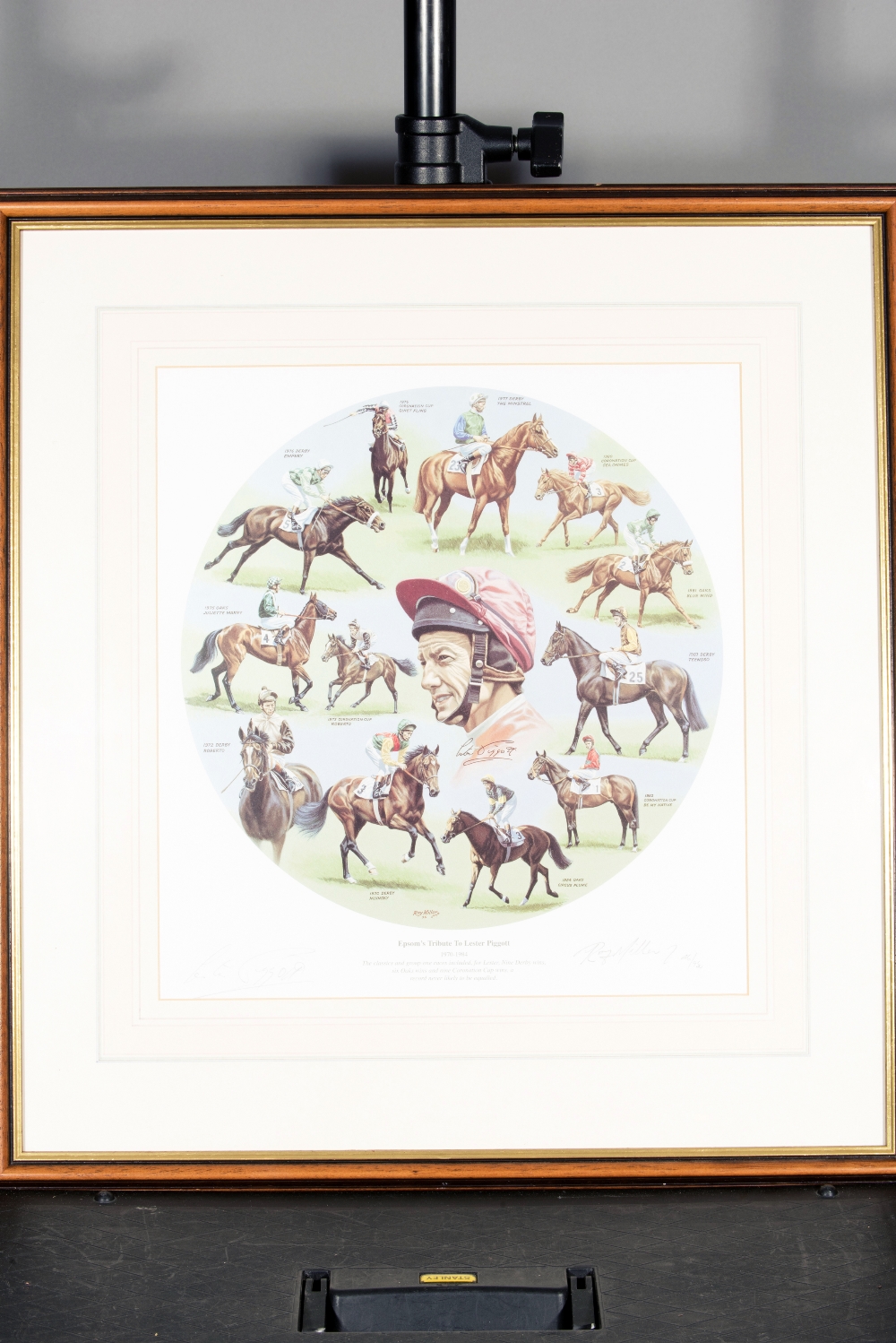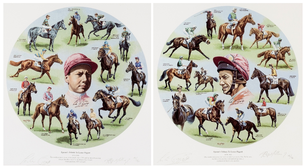 A pair of signed limited edition prints titled ''Epsom's Tribute To Lester Piggott'', with artwork by Roy Miller numbered 46/960, both signed in pencil by Lester Piggott and the artist, the imagery featuring Lester's Derby, Oaks and Coronation Cup winners between 1953 and 1984, mounted, framed & glazed, 58 by 53cm., both with a COA taped to the backboard