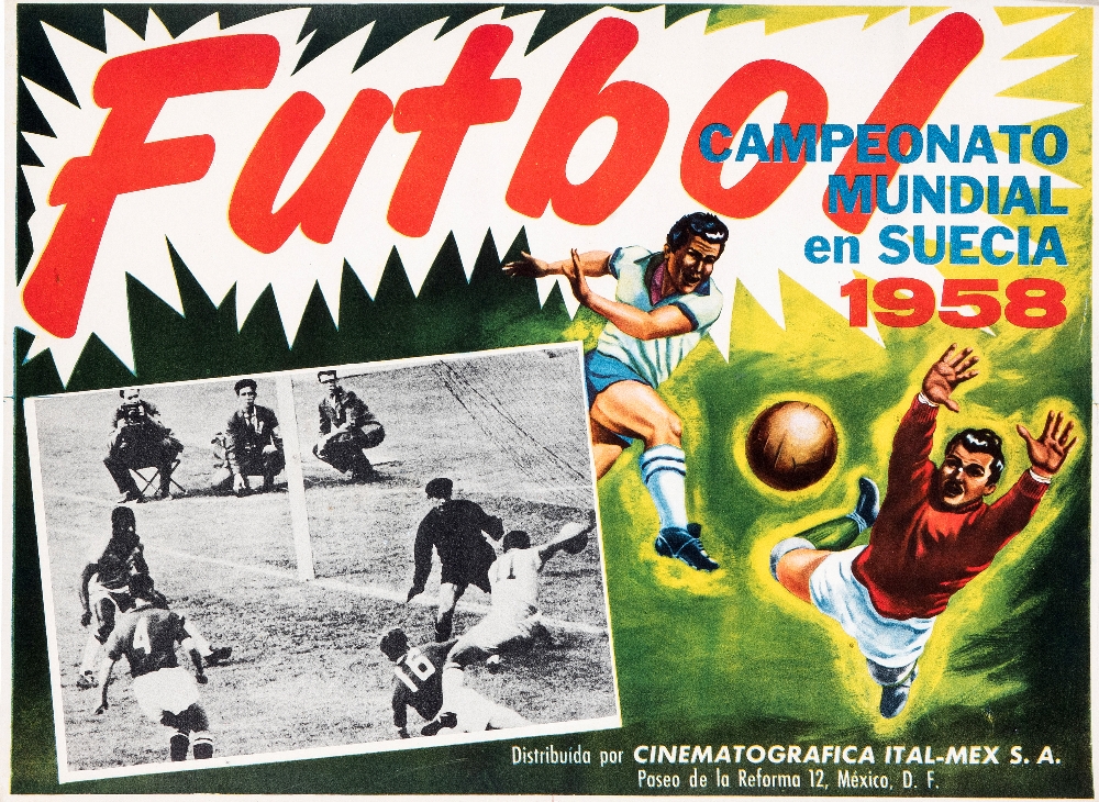 Mexican poster promoting a cinema screening of the1958 World Cup, graphic art and photography but featuring different b&w photographs in the bottom left hand box, printed on stiff card, 32 by 44cm., backed onto linen, very good condition, rolled The auctioneer has seen this poster with various different match-action photographs inserted which suggests that there were regular screening throughout the duration of the tournament.