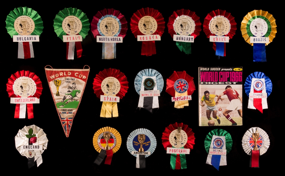 A collection of 17 1966 World Cup rosettes, comprising Argentina, Brazil, Bulgaria, Chile, England (two), France, Hungary, Italy, Mexico, North Korea, Portugal (two), Russia, Spain, Switzerland, Uruguay & West Germany; together with a 1966 World Cup pennant; and a World Soccer '66 WC Digest (19)