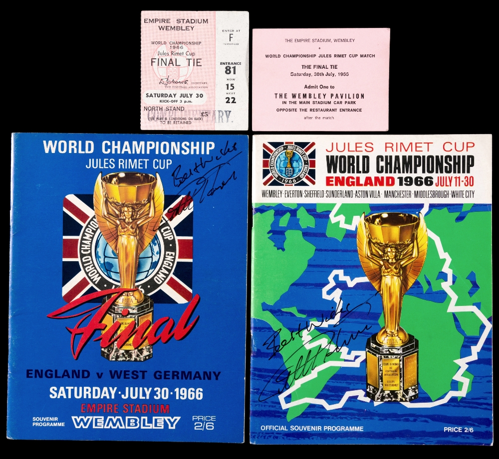 1966 World Cup memorabilia formerly in the collection of the West Ham United player Brian Dear and given to him by his team-mate Geoff Hurst, Final and Tournament programmes which Hurst later signed for Dear; together with a a Final Tie hospitality pass and a complimentary match ticket (4)