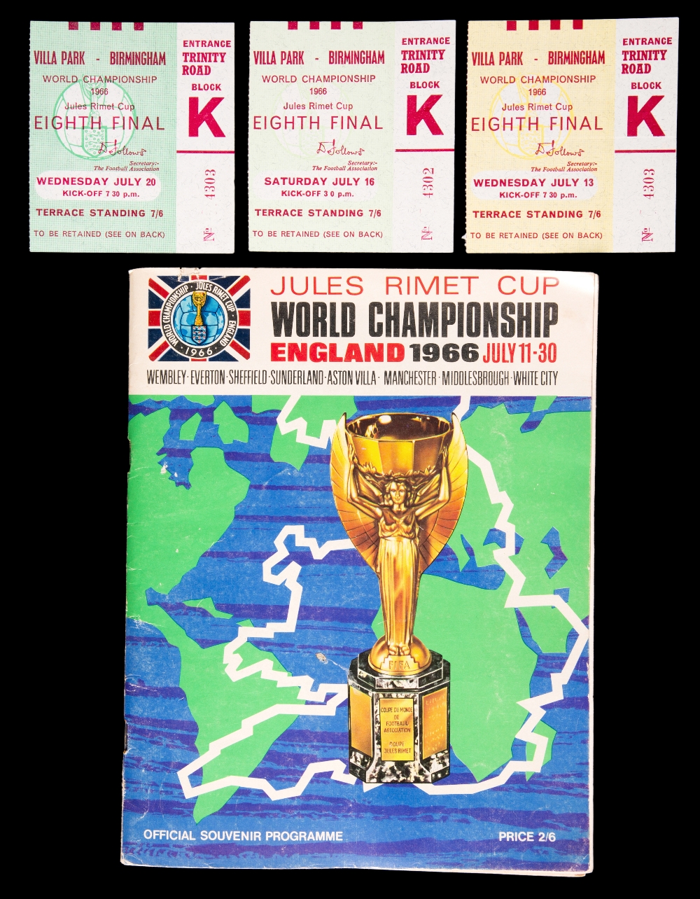 Three 1966 World Cup tickets for the matches played at Villa Park, in Group 2 Argentina v Spain, Argentina v West Germany & Spain v West Germany, complete with original paper wallet, printed information and press cuttings; the lot also including a tournament programme