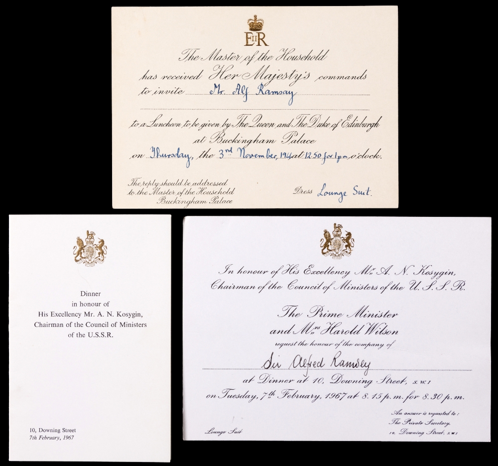 Two printed invitations addressed to Mr & Sir Alf Ramsey, the first for a luncheon given by the Queen and the Duke of Edinburgh at Buckingham Palace 3rd November 1966; the other from Prime Minister Harold Wilson for a dinner at 10 Downing Street in honour of a Soviet Minister; the lot also including the menu for the Downing Street dinner (3)
