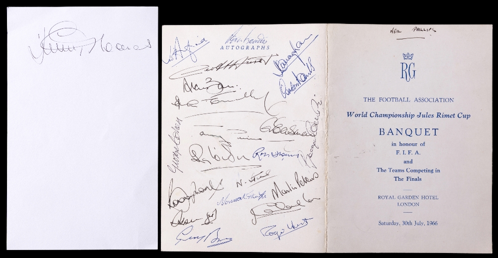 England autographed 1966 World Cup Final celebration banquet menu, held at the Royal Garden Hotel, London, 30th July, signed to the back cover in ink by 21 members of the England squad, Jimmy Greaves did not attend the evening but his signature is represented separately in the lot (2) These autographs were collected by the England assistant-team doctor Neil Phillips.