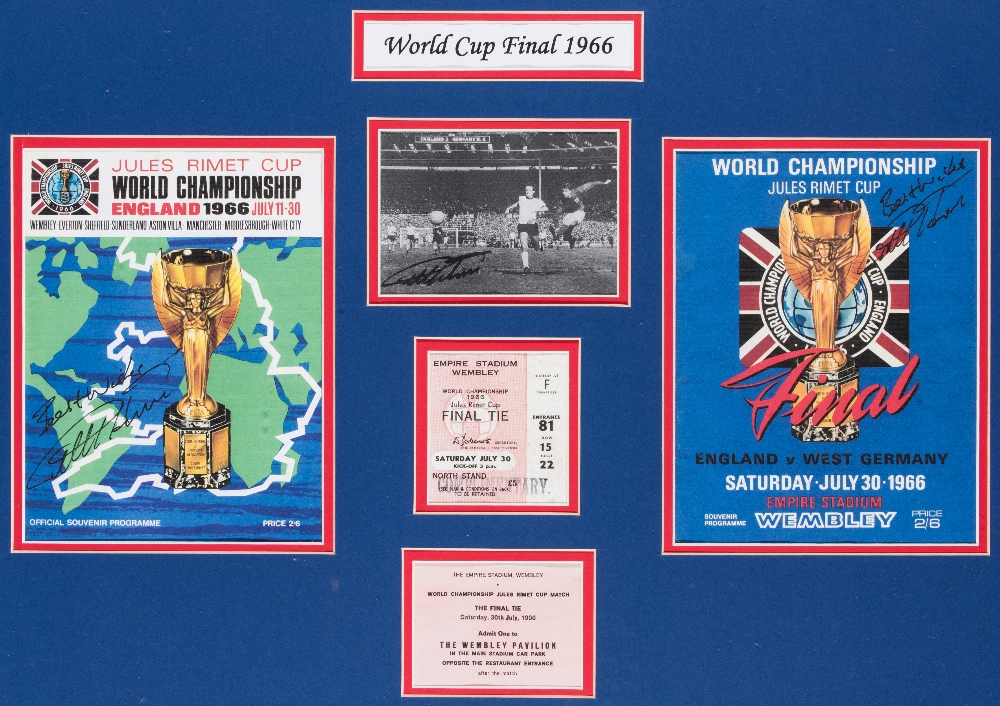 A Geoff Hurst signed 1966 World Cup memorabilia display, comprising the Final and Tournament programmes, both signed in black market pen by Hurst, a Final Tie ticket, a post-match pass to the Wembley Pavilion, a Hurst-signed b&w picture depicting the hat-trick goal, and a printed tile legend, mounted, framed & glazed, 54 by 72cm.