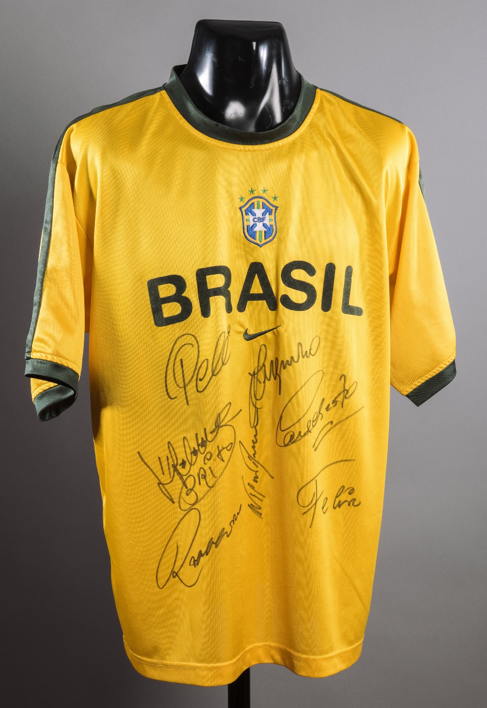 Replica 4-star Brazil jersey signed by seven members of the 1970 World Cup winning team, signed in black marker pen by Pele, Brito, Rivelino, Felix, P