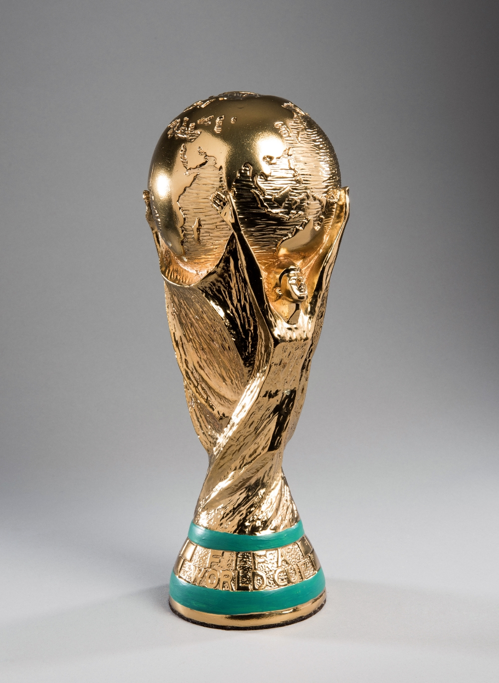 A full-size replica of the FIFA World Cup trophy, height 35cm., extremely heavy weighing some 4kg., gilt finish, green painted 'malachite' bands