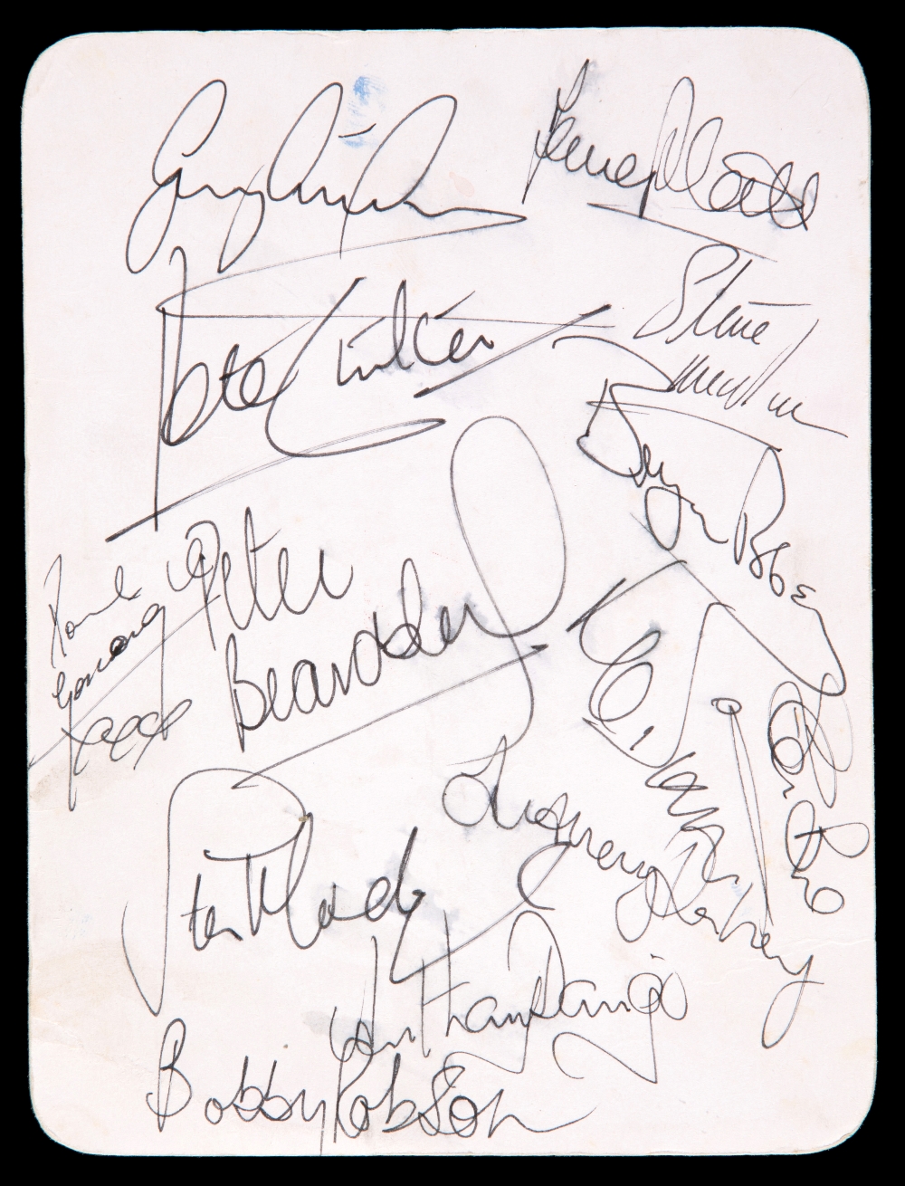 A signed tribute dinner invitation for the England 1990 World Cup football squad, organised by the Leeds Regional Committee of The Variety Club of Great Britain, held at the Queen's Hotel, Leeds, 22nd April 1990, the reverse signed by 13 members of the England party including Bobby Robson, Bryan Robson, Gary Lineker, Paul Gascoigne, Peter Shilton, David Platt, Peter Beardsley, Steve McMahon, Tony Dorigo, Steve Hodge etc.