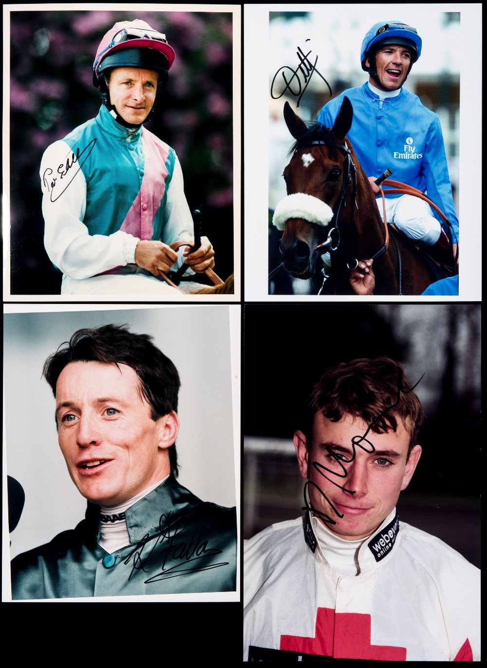 An album of signed photographs of flat race jockeys, in sleeves in a ring binder file, 8 by 10 & 10 by 12in., colour & b&w, 109 photographs bearing 117 signatures, often multiple signings by the one individual, subjects including Pat Eddery, Frankie Dettori, Kieren Fallon, Mick Kinane, Jimmy Lindley, Joe Mercer, Ryan Moore, Olivier Peslier, Johnny Murtagh etc.