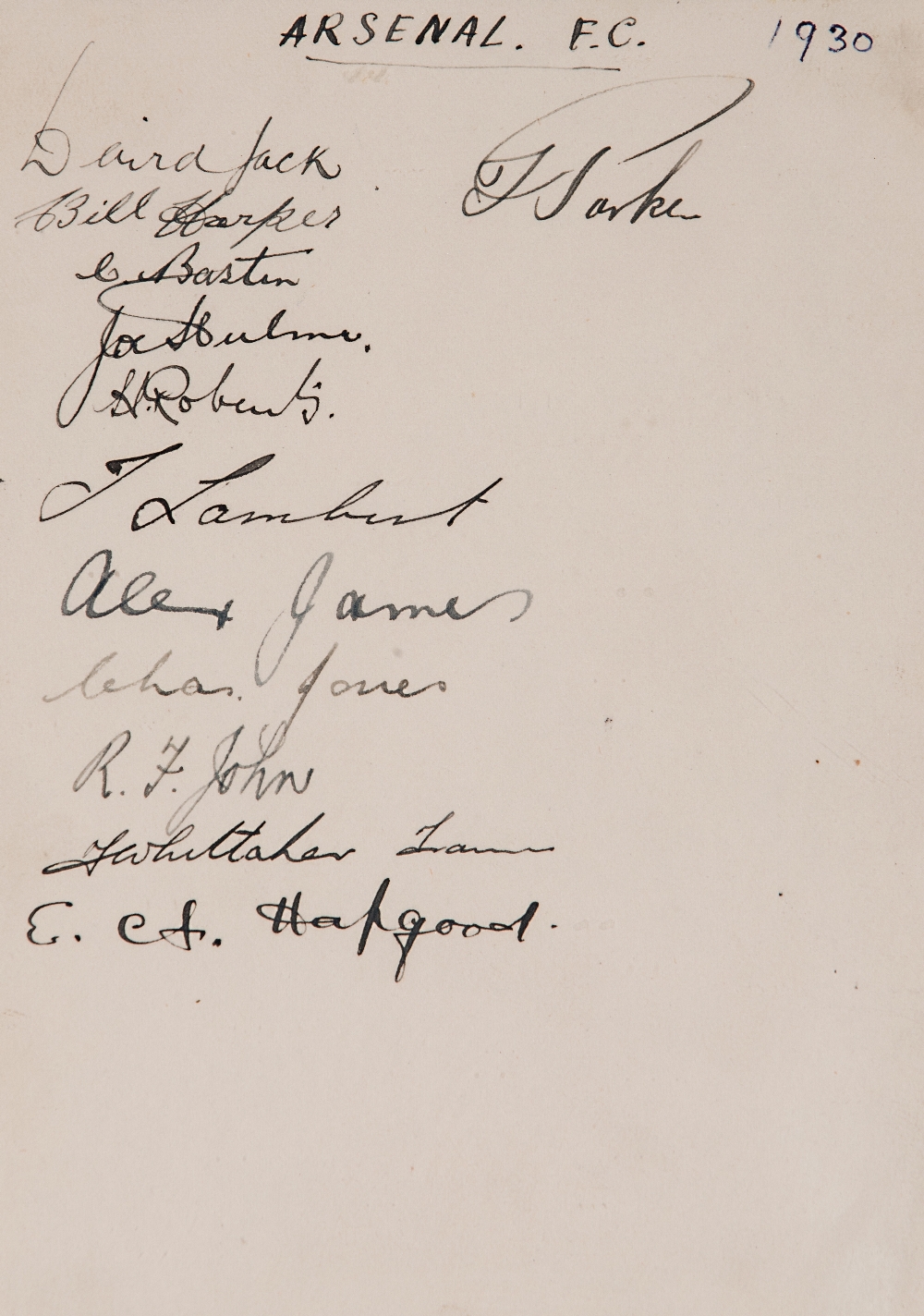 Autographs of the Arsenal 1930 football team, 12 signatures in ink on an album page comprising Jack, Harper, Bastin, Hulme, Roberts, Lambert, James, Jones, John, Whittaker (trainer), Hapgood & Parker, mounted, framed & glazed, 28 by 22cm.