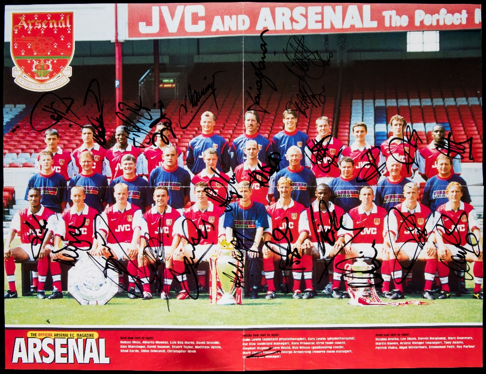 Arsenal poster signed by the 1997-98 Arsenal double-winning team, the team-group photo taken before the start of the following season, signed by Wenger and every squad player, Seaman, Anelka, Dixon, Bergkamp, Keown, Adams, Vieira, Petit etc.