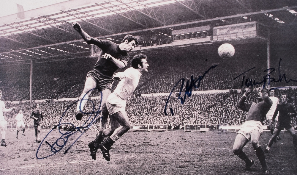 A b&w photographic print of the 1970 F.A. Cup final autographed by the Chelsea Cup winners Peter Osgood, Ron Harris & Tommy Baldwin, the 12 by 20in. image portraying a Peter Osgood header on goal, signatures in blue marker pen, mounted, framed under Plexiglass, 46 by 64cm., 18 by 25in.