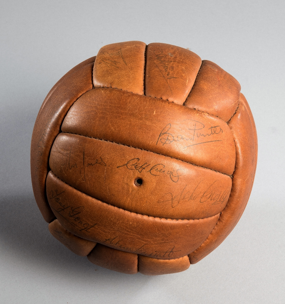 A football signed by the Hereford United team in the John Charles player/manager era, brown leather football extensively signed in biro and including players who later achieved football immortality in the giant killing F.A. Cup win over Newcastle United in 1972, including Ronnie Radford, McLaughlin, Jones, Tyler, Gough, Addison et al., also signed by John Charles; sold with a scan from a newspaper article at the time showing Charles donating this ball to a charity auction organiser (2)