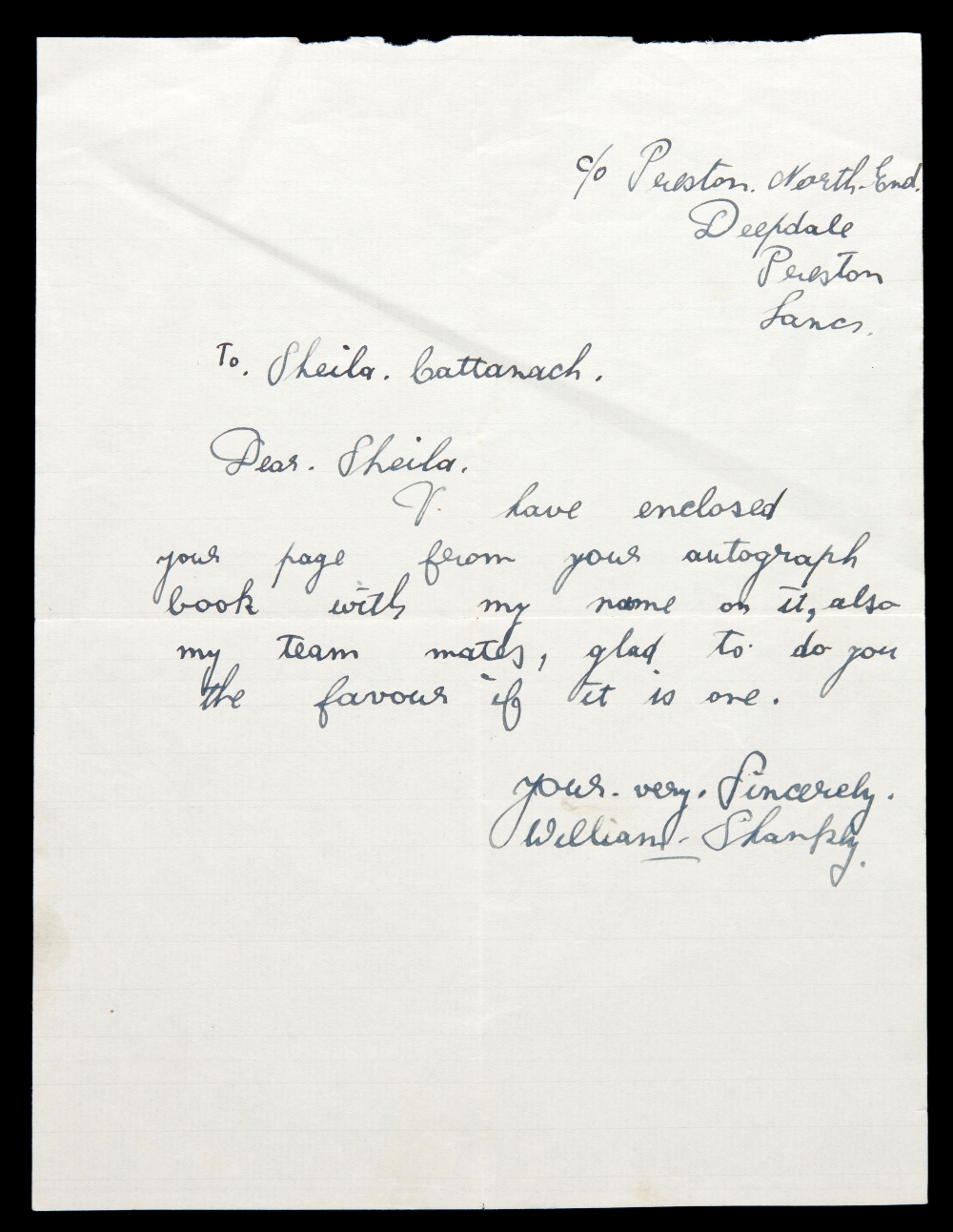 A manuscript letter featuring the full signature of Bill Shankly circa 1937, one page letter, in ink, written in response to a fan while at Preston North End, signed ''Yours very sincerely, William Shankly''