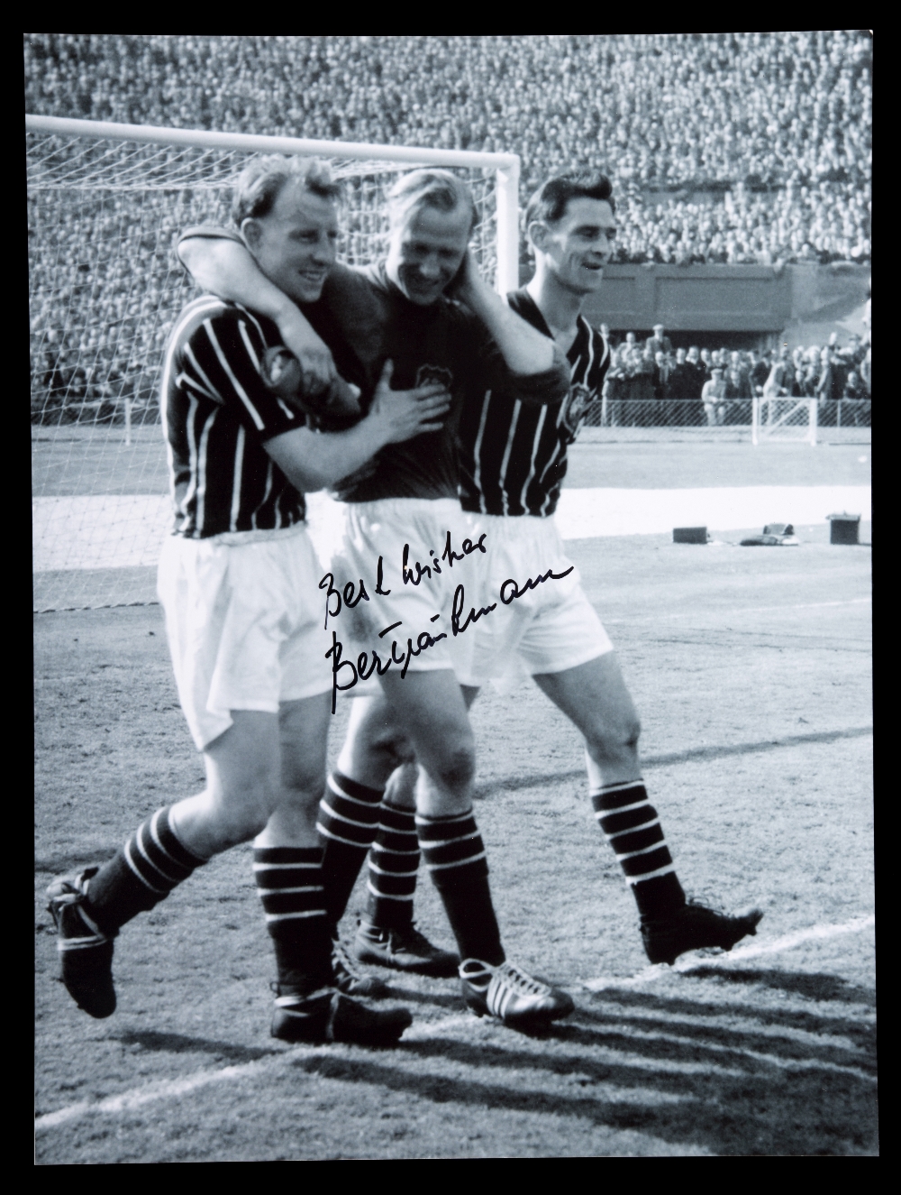 Bert Trautmann signed large photograph, 16 by 12in. b&w, being congratulated by team-mates and nursing his injured neck after the 1956 F.A. Cup Final, signed BEST WISHES in black marker pen