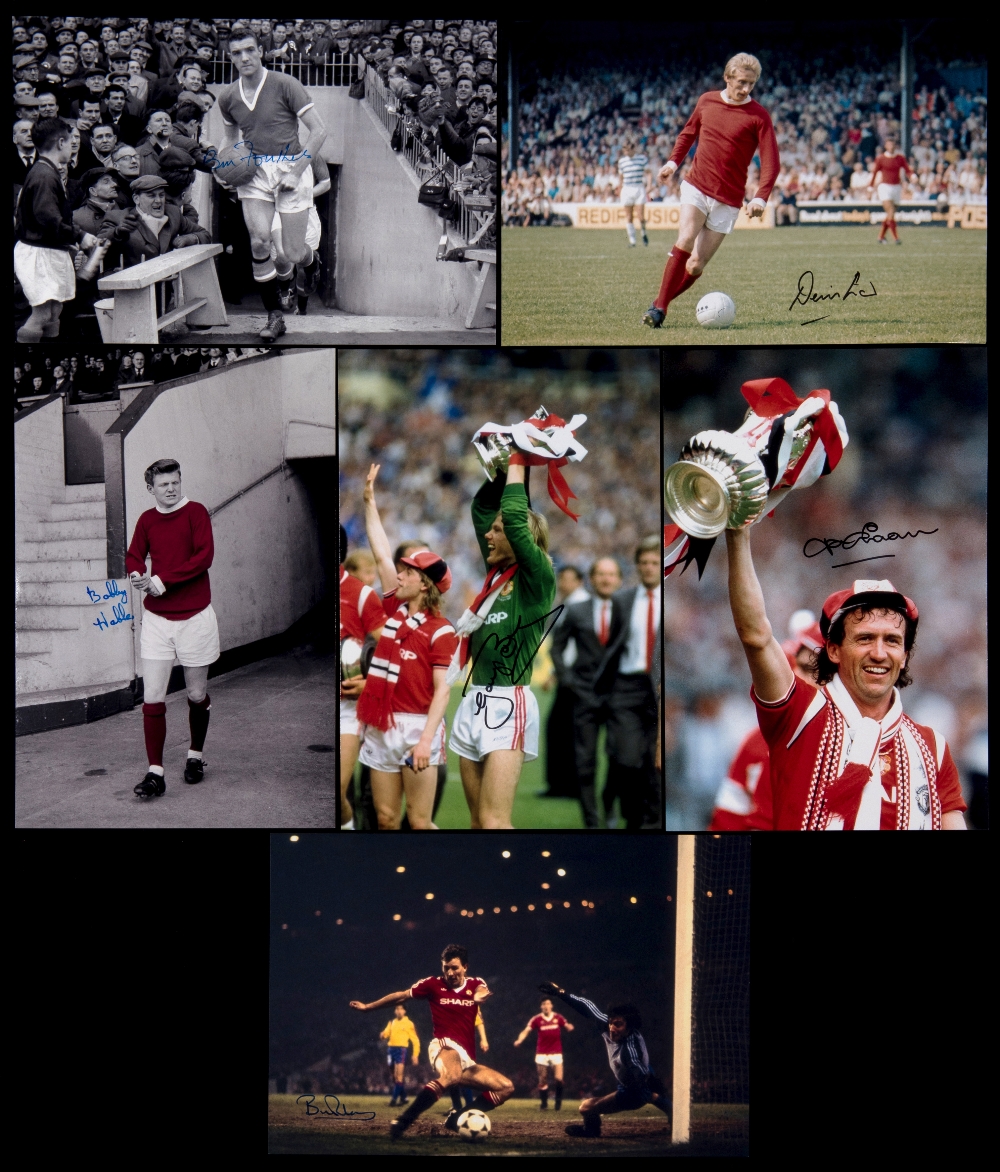 Autographed Manchester United football photographs, 52 in total, all featuring former Manchester United players from the 1950s - 1990s, all measuring 12'' x 8'' and signed using permanent markers, including fine examples of Law, Bailey, Jordan, Sharpe, Noble, Gidman, Foulkes, Crerand, Scholes, Whitefoot etc, comes with a Certificate of Authenticity