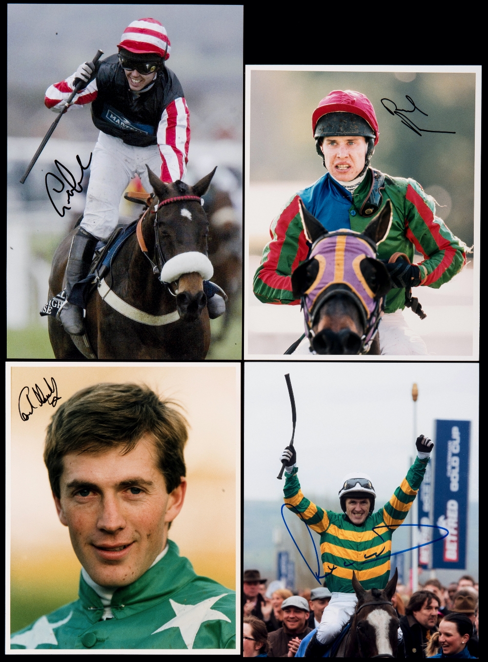 An album of signed photographs of National Hunt jockeys, in sleeves in a ring binder file, 8 by 10 & 10 by 12in., colour & b&w, 106 photographs bearing 108 signatures, often multiple signings by the one individual, subjects including Barry Geraghty, Richard Guest, Richard Johnson, Graham Lee, Carl Llewellyn, Graham McCourt, A P McCoy, Stan Mellor, Peter Niven etc.