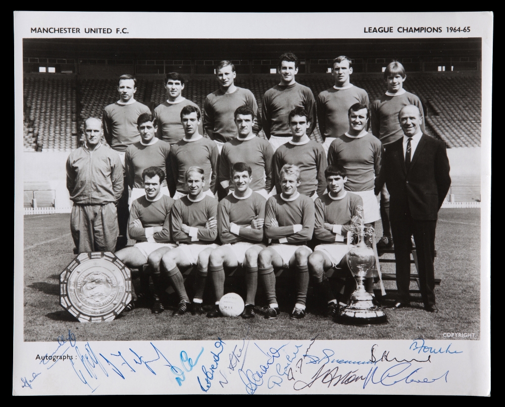 Manchester United signed 1964-65 team-group photograph, 8 by 10 b&w., 15 signatures in ink to the lower margin, Best, Stiles, Charlton, Law, Foulkes e