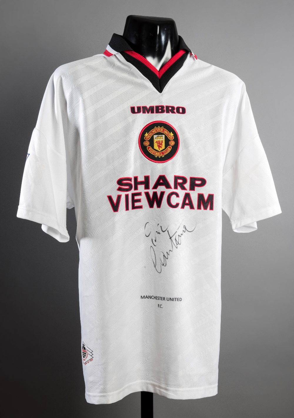 Eric Cantona signed Manchester United replica jersey, a white away 1996-97 away jersey signed in black marker pen