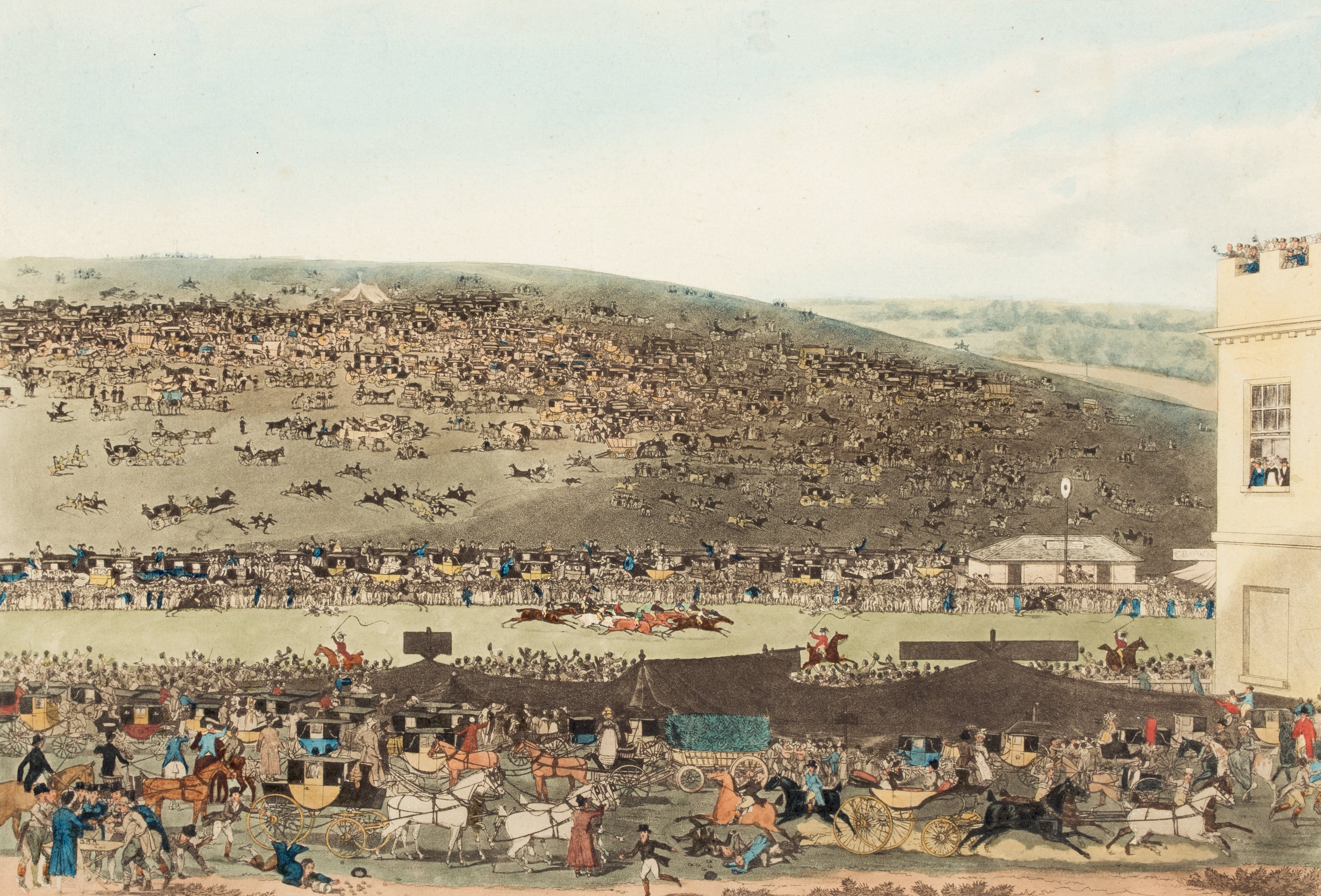 By and After James Pollard (1792-1867) EPSOM RACES colour aquatint, Derby Day circa 1820, black & gilt Hogarth frame, overall 40 by 56cm.