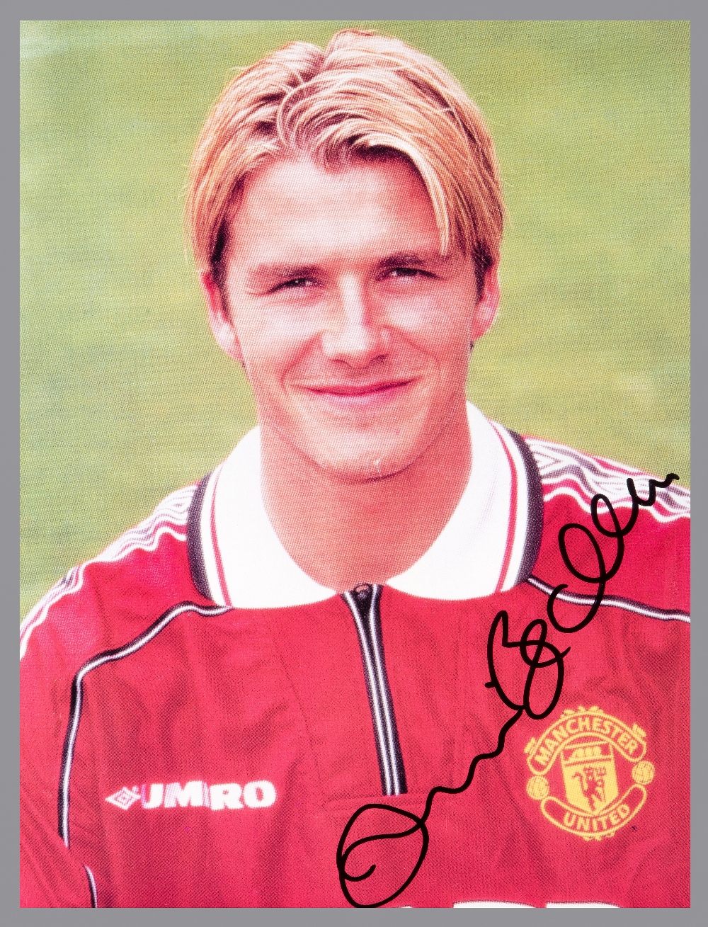Signed colour photograph of Manchester United legend David Beckham, signed in marker pen, 10 by 8in. mounted, framed & glazed , 38.5 by 34cm.