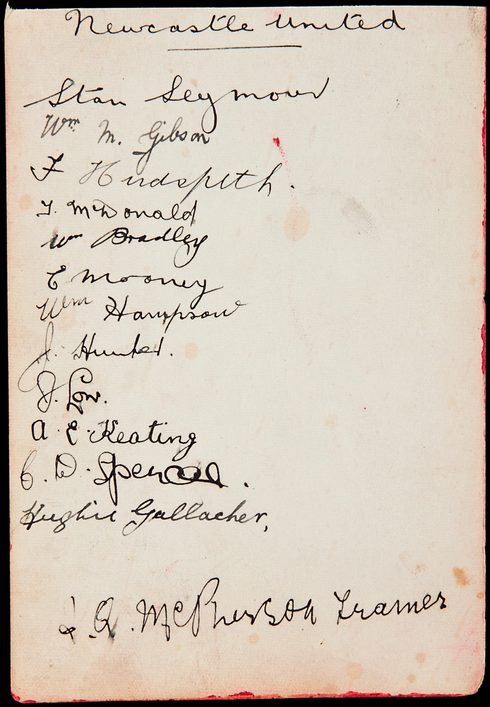 Newcastle United autographs circa 1925-26, in ink on an album page, including nine of the 1924 F.A. Cup winners, Bradley, Hampson, Hudspeth, Mooney, Spencer, Gibson, Low, McDonald & Seymour, plus new signing Hughie Gallacher