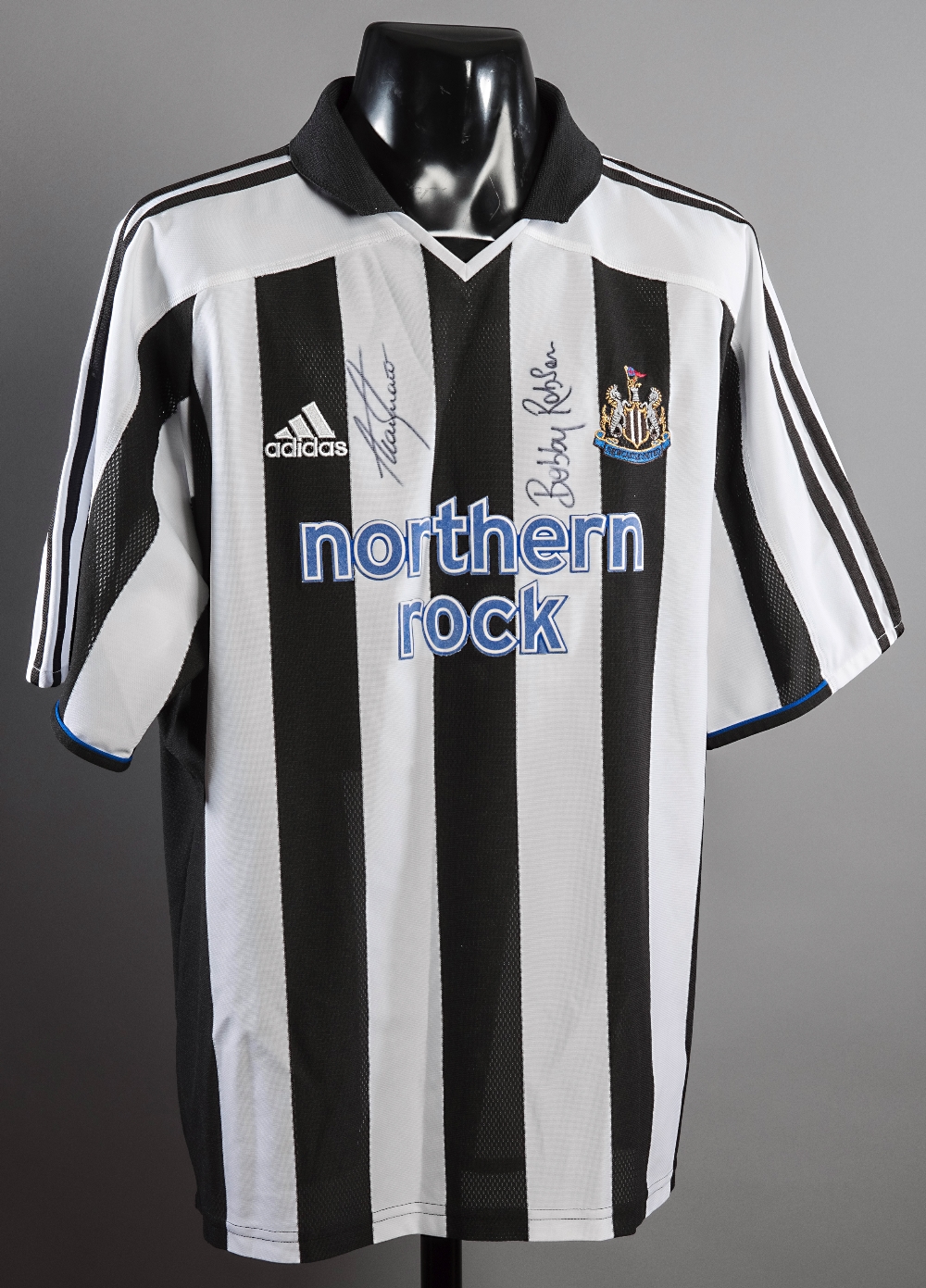 Newcastle United replica jersey double-signed by Alan Shearer and Bobby Robson, signatures in black marker pen