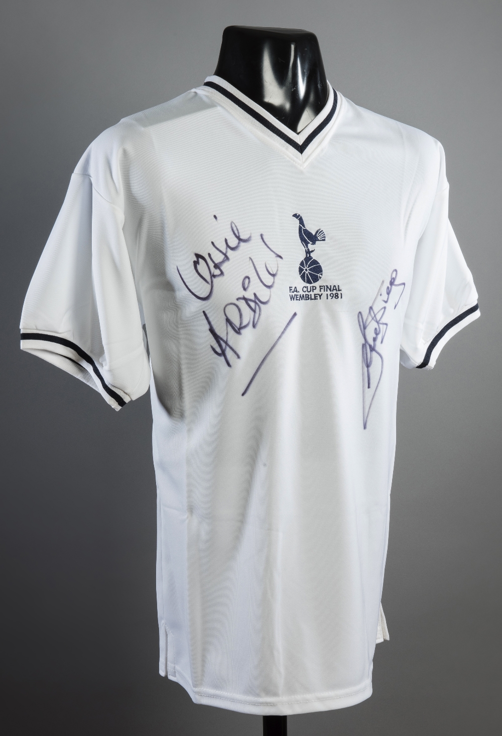 Tottenham Hotspur 1981 F.A. Cup Final retro jersey double-signed by Ossie Ardiles & Ricky Villa, signatures in black marker pen