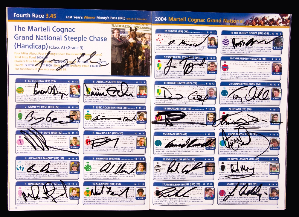Five signed Grand National racecards, i) 1994 (Miinnehoma) signed by all the competing jockeys ii) 2004 (Amberleigh House) signed by all the competing jockeys and additionally by Ginger McCain iii) 2010 (Don't Push It) signed by A P McCoy & Jonjo O'Neill iv) 2011 (Ballabriggs) signed by Donald McCain Jnr. & Jason Maguire v) 2015 (Many Clouds) signed by Leighton Aspell