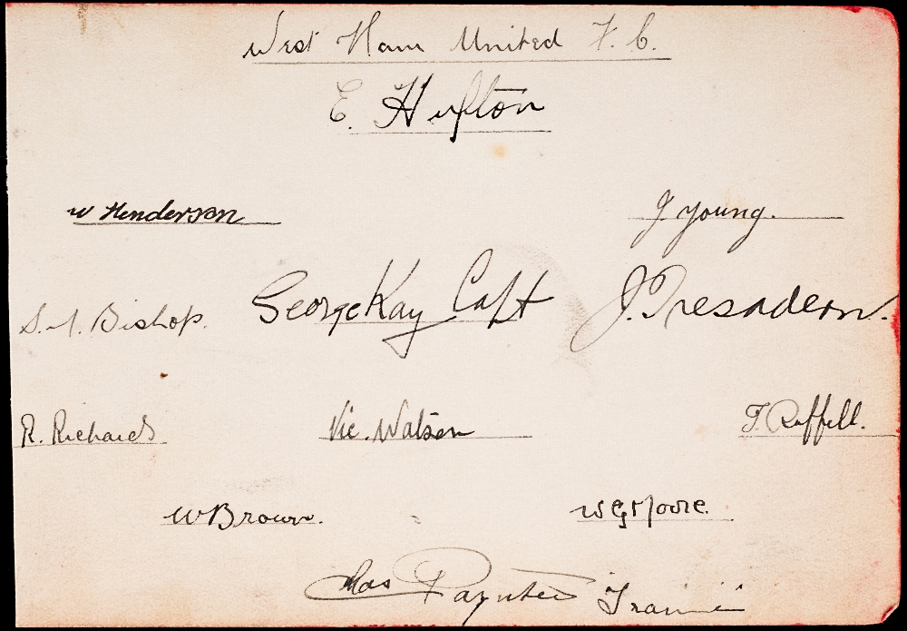 The autographs of the West Ham United team who played in the first F.A. Cup Final at Wembley in 1923, on an album page, the players have signed in ink in their field formation, Hufton, Henderson, Young, Bishop, Kay, Tresadern, Richards, Brown, Watson, Moore & Ruffell, additionally signed by trainer Charlie Paynter
