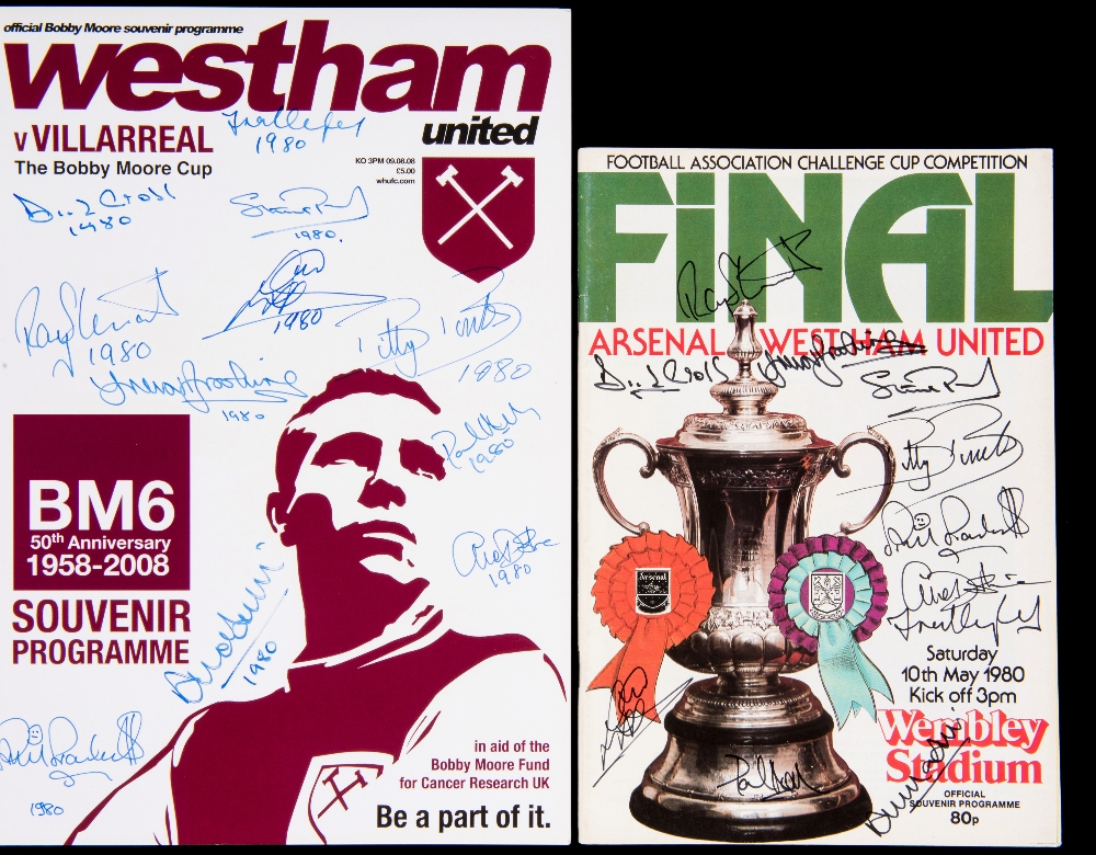 Autographed West Ham United 1980 F.A. Cup Final programme, superbly signed to the front cover by all eleven players in black marker, together with a programme issued for 'The Bobby Moore Cup' v Villareal at Upton Park in 2008, signed by the 1980 FA Cup winning team to the front cover in fine blue marker - with each player adding 1980 after their respective signature, both items come with a Certificate of Authenticity