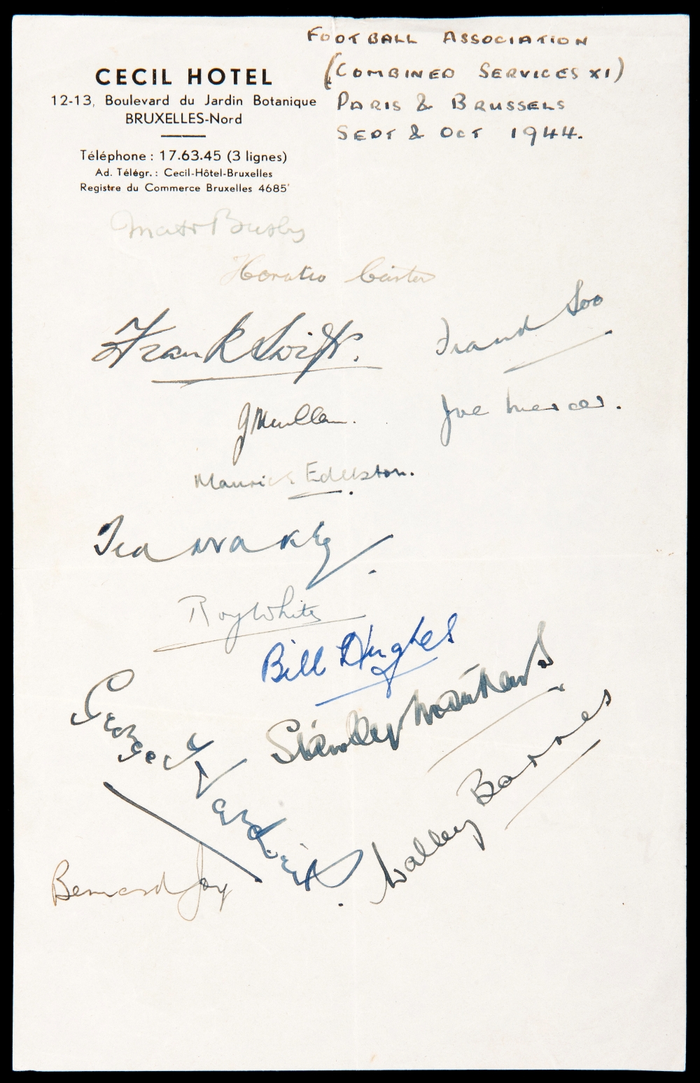 Autographs of the Football Association Combined Services XI who played in Paris & Brussels September & October 1944, 14 signatures in ink, including Busby, Carter, Soo, Mercer, Matthews, Barnes, Hardwick, Joy etc., on hotel headed paper