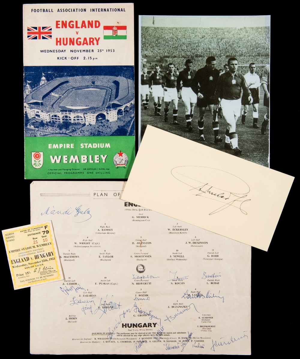 1953 England Hungary autographs, a line-ups page removed from the programme signed by the Hungary 'Mighty Magyars', Puskas did not sign the programme but his autograph is represented separately in the lot by a signed card; sold together with a complete match programme, a ticket stub, a picture of the Hungarian team mounted on board, and a title plaque (6)