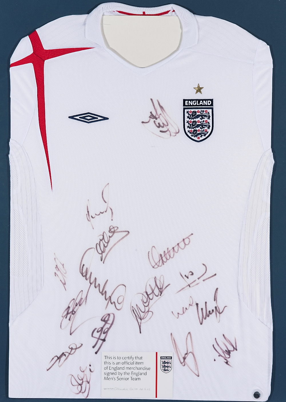 A white England football jersey signed by the touring squad to USA and Colombia in May 2005, mounted with a COA issued by the Football Association, si