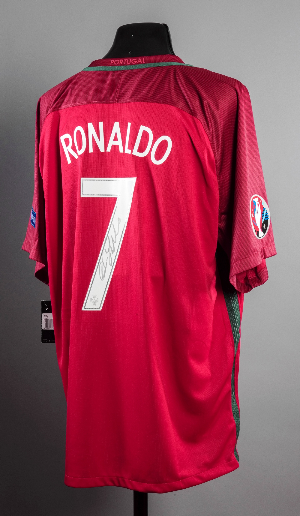 Cristiano Ronaldo signed replica of his Euro 2016 Final Portugal jersey, the red jersey fully badged and with match inscription, signed to the reverse
