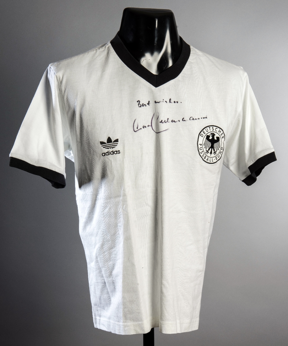 Franz Beckenbauer signed white West Germany No.5 replica international football jersey, signed in black marker pen and inscribed BEST WISHES