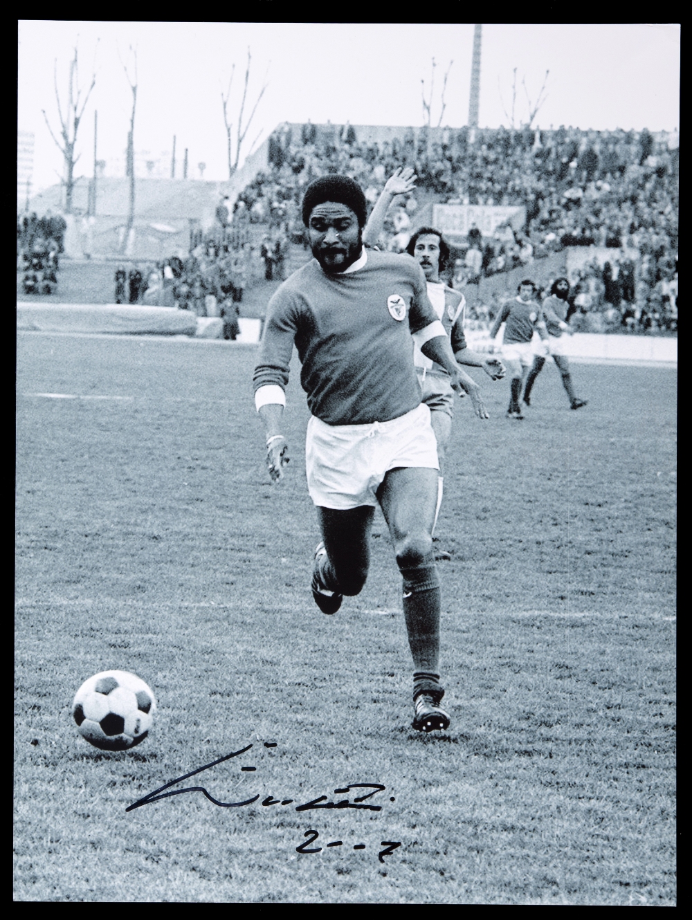 Eusebio signed large photograph, 16 by 12in. b&w in action for Benfica, signed in black marker pen and dated 2007