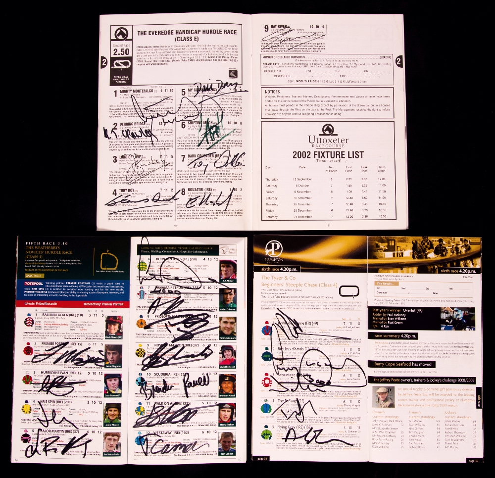 Three autographed A.P. McCoy career milestone racecards, all signed by McCoy to the front cover and additionally all the other competing jockeys as well as McCoy himself in the specific race, comprising: i) Uttoxeter 27th August 2002, 2:50 The Everidge Handicap Hurdle, won on Mighty Montefalco to become the winning most jockey in National Hunt racing, his 1,700 career win, beating Richard Dunwoody's total of 1,699 ii) Plumpton, 9th February 2009, 4:20 The Tyser & Co Beginners' Steeplechase, won on Restless d'Artraix, AP's 3,000th career win iii) Towcester, 7th November, 3:10 The Weatherbys Novices' Hurdle, won on Mountain Tunes, 4,000th career win