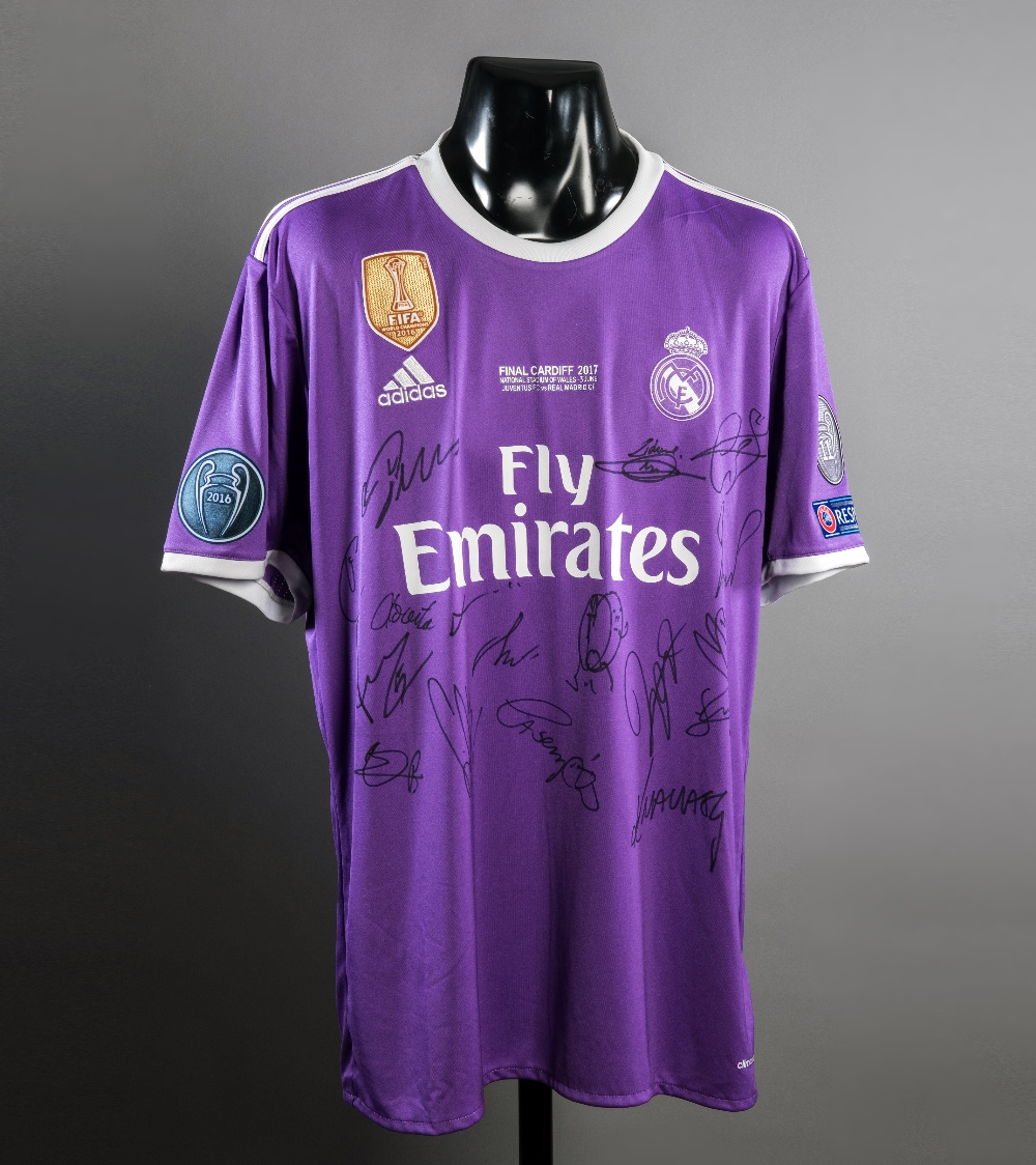Team-signed replica of Cristiano Ronaldo's Real Madrid 2017 Champions League Final jersey, the purple jersey with full badging and match inscription, signed in black marker pen by coach Zinedine Zidane and 16 players Ronaldo, Bale, Benzema, Asensio, Kroos, Morata, Coentrao, Modric, Ramos, Isco, Marcelo, Casemiro, Carvajal, Pepe, Varane & Navas