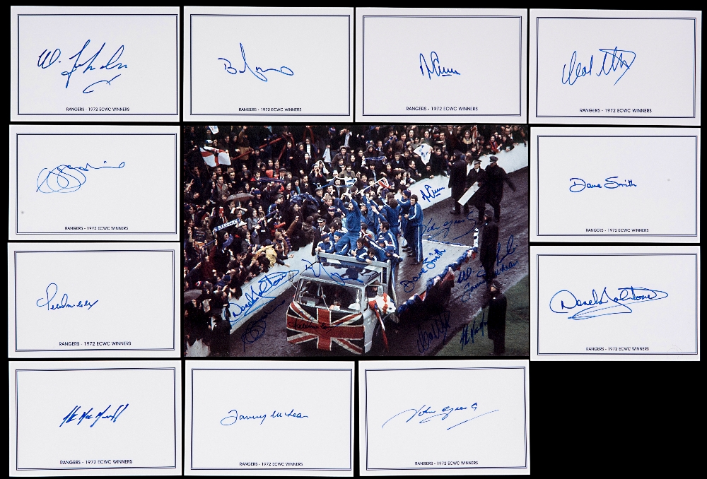 Autographed Rangers FC 1972 European Cup Winners Cup colour photograph, measuring 12'' x 8'', depicting a wonderful image of the Rangers team parading the European Cup Winners Cup around a packed Ibrox on the back of a coal truck during homecoming scenes after victory in the 1972 Final, signed by all eleven players in fine blue marker, together with eleven 6'' x 4'' photo-cards individually signed by the players and also a superbly produced modern book 'When Football was Football - Rangers edition' signed to the title page in blue biro pen by 10 of the team, each item comes with a Certificate of Authenticity