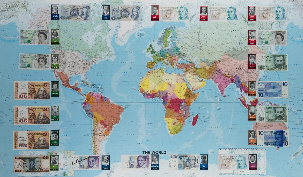 Signed Footballers of the World framed display, comprising a large scale map of the world applied with 20 banknotes each bearing the autograph of an i