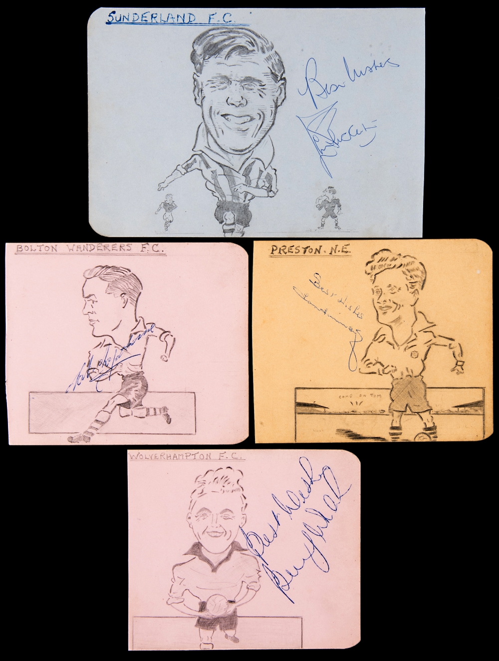 A collection of album pages with signed artist drawn caricatures of footballers from the 1951-52 season, 21 pages, 16 are back-to-back subjects, 41 drawings in total of which 37 are signed by the players, team representation includes Preston, Charlton, Burnley, Fulham, Sunderland, Bolton, Wolves, Doncaster & Huddersfield, famous stars include Shackleton, Wright, WiIliams, Bartram, Lofthouse, Finney, Cummings etc.