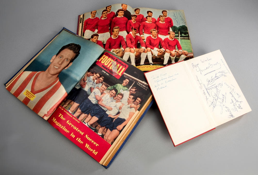 Collection of bound volumes of Charles Buchan's Football Monthly magazine many bearing autographs, plus two Buchan's Soccer Gift Books similarly autographed, 1950s to early 1960s, the seller has marked the autographed pages, mostly Manchester United & Spurs autographs, but others including Arsenal; sold together with a (post-Munich) Manchester United team-signed copy of Matt Busby's My Story; the lot also including seven further bound volumes, unsigned; and a small quantity of football programmes including 1950s F.A. Cup Finals, England etc.