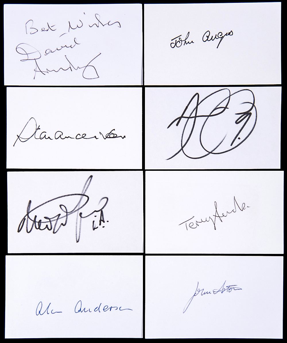 Autographed football index cards, 213 in total, all measuring 5'' x 3'' and signed in the main by players from the 1950s - 1980s, including fine examples of Anderson, Finney, Hunter, King, McCoist, Phillips, Sunderland, Toshack, Trebilcock, Todd, Turnbull, Ufton, Woodruff etc, comes with a Certificate of Authenticity