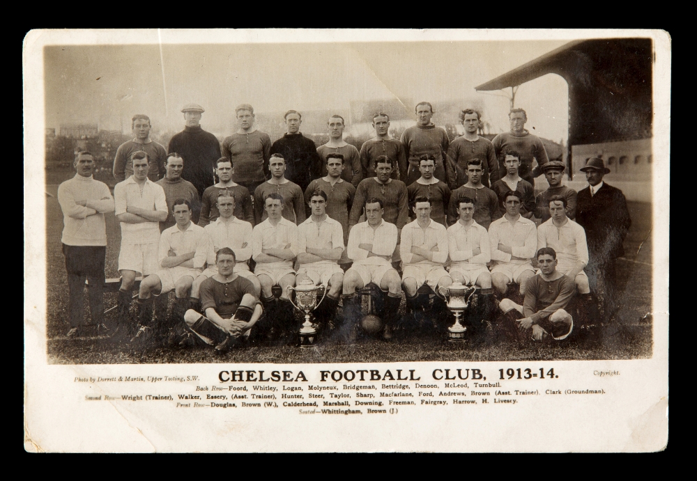 Two Chelsea FC team-group postcards from season 1913-14, the first card featuring the full squad; the other titled ''the first Chelsea football team t
